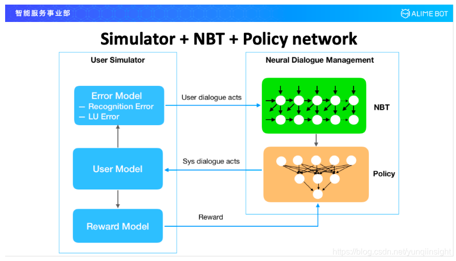 无论是端到端的一步训练还是先预训练再调优,只要涉及增强学习这一块,都需要有一个外部环境,所以在我们的实现架构里面,引入了模拟器的概念,就是user simulator。模拟器这主要分为三大块,一个是 user model,用来模拟人的行为的;第二个是 error model,模拟完人的行为以后经过 error model 引入一个错误扰动,用 user model 产出的只是一个概率为 1 的东西,它对网络训练是不够好的,error model 会对这个结果进行扰动并给他引进几个其他的结果,并且把概率分布进行重新计算一下,这样训练出的模型在扩展能力或者泛化能力上会更好一些;第三个模块是 reward model,用来提供 reward 值。这是我们今天在整个增强学习的对话管理这块的一些工作。