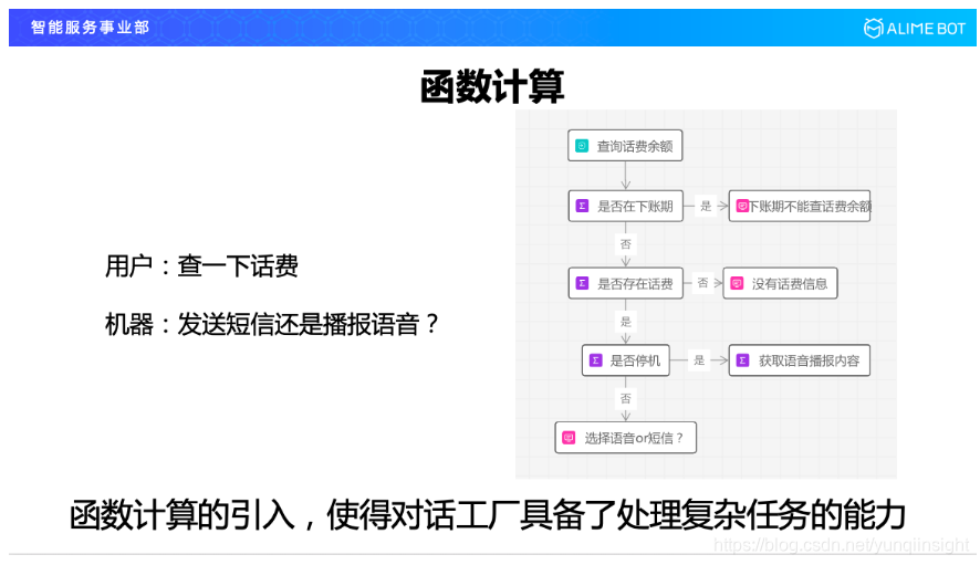 函数计算是什么东西呢?还是举一个例子吧,比如说,10086 里面用户说要查一下话费,10086 那边的机器人就会回复一句是发短信还是播放语音,表面看来就是简单的一入一出,其实在这背后要经过多轮的服务查询,才能完成这个结果,因为当要查话费的时候,先要经过函数计算查一下现在是哪一天,如果是下账期的话是不能查话费的,就是每个月的最后一天不能查话费,如果可以查话费的话,先看一下用户是否存在话费,如果存在花费的话第三步调用的服务看是不是停机了,因为停机了的话只能语音播报不能接收短信。所以看一下在一个简单的一入一出的对话背后,是走了一个复杂的流程的,这些流程今天都是在机器端用代码来实现的。函数计算的引入,使对话工厂可以去处理复杂的任务。