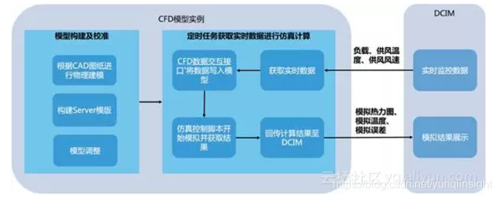 如图所示为沙盘系统的流程图。在模型达到预期精度后,团队进一步解决了CFD模拟的自动化问题。通过接入阿里巴巴自研的数据中心实时监控系统(DCIM),我们获取到实时的服务器功耗、空调出风温度和风机转速等数据,通过6Sigma开放SDK将数据写入CFD模型,从而使得模型能够实时模拟包间内真实情况。此外,一旦仿真计算完成后,我们将计算结果从模型中导出,回传到监控系统,从而完成一次仿真计算的闭环。