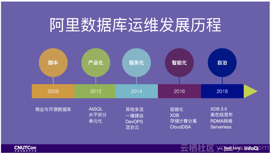 阿里巴巴数据库运维发展的历程,主要有这几个阶段。09年以前,以商业数据库为主,去IOE也才开始。之前没有整体运维规划、运维平台。使用了各类脚本、工具。
