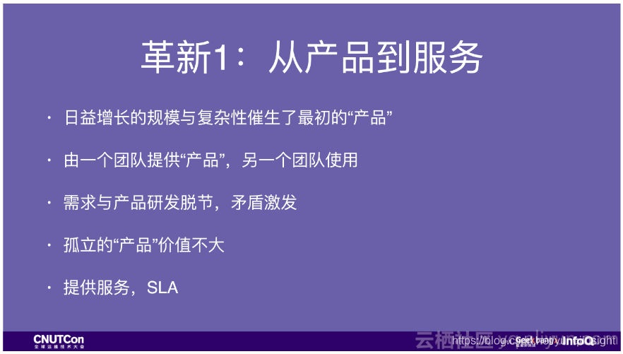 第一次是从产品化到服务化。最初,我们的产品形成非常简单。没有什么平台,没有什么系统,大家一边干活一边沉淀一些脚本,到处分发。随着规模的增长,原来的那套脚本需要管理起来了,我相信很多团队最开始都会设立一个工具组,专门来干这个事情。这就会演变成一个团队做工具,另一个团队来使用,慢慢的两者之间的GAP就出现了。工具团队有工具团队的KPI,业务团队有业务团队的KPI,分歧会逐渐增大。