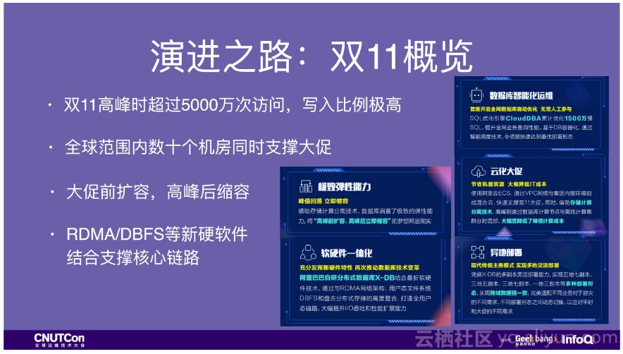 当然技术的积累是一个长期的过程,积累到一定程度就会引起质变。我们这些年在系统建设、技术积累方面所做了许多工作。先来看一组数据,这是刚刚过去的双十一数据库相关的一些情况。