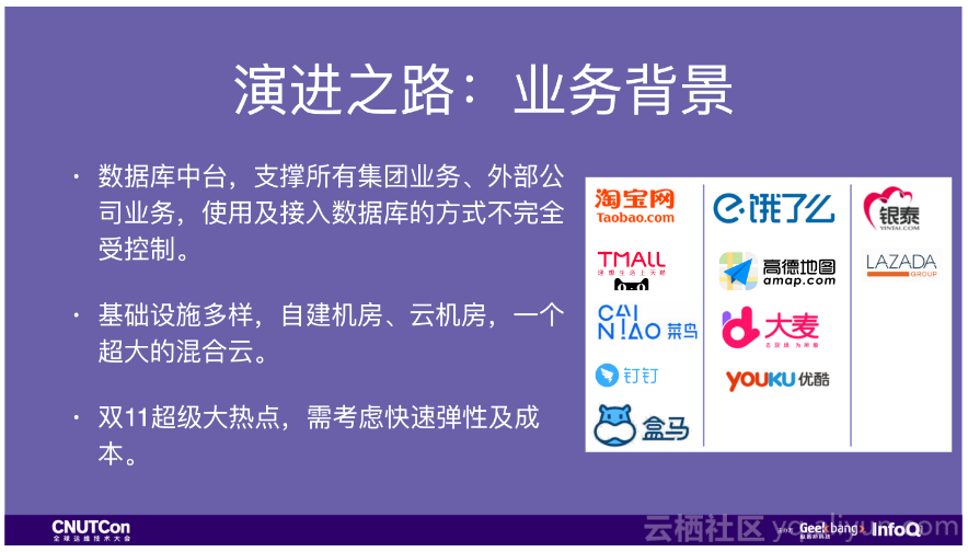- 业务多样性。作为数据库中台,数据库团队要支撑集团所有业务。包括核心电商、线下新零售场景以及各个独立子公司。各种场景对数据库的要求也不一样,比如线上场景就要求高并发低延时,故障快速恢复。线下场景则要求绝对可用,而且接入及使用数据库的方式都不受控制。而新加入阿里体系的收购公司,有原来的运维体系,要求他们做改变也不太现实。总之需求的多样性对数据库的要求非常高。
