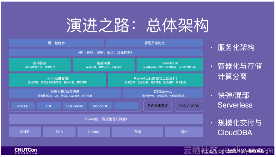 解决架构问题后,我们过去两年主要围绕几个能力进行建设,一是容器化与存储计算分离,二是快速弹性与混部的能力,三是规模化交付与智能运维,这几项工作都是今天能够发展成为集团数据库中台以及支撑双十一的关键能力。