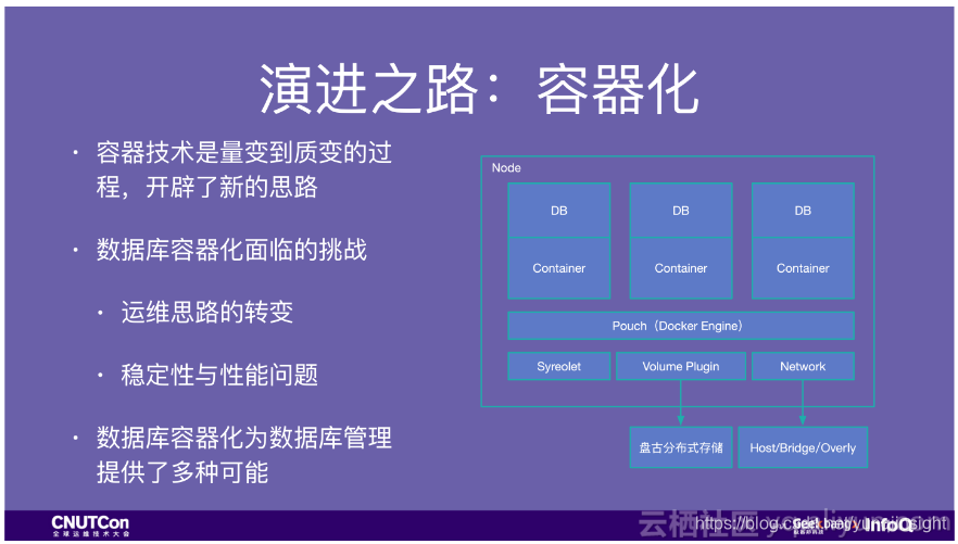 第一,容器化是技术的量变到质变,容器并没有很多开创性的技术,各种技术合在一起开辟了新的思路。所以在把数据库放到容器里首先要突破我们的运维思路,坚定可以把数据库放到容器里的这个想法。当然这个过程中也遇到过稳定性和性能问题,比如网络在使用bridge模式的时候,会有些CPU的增加。