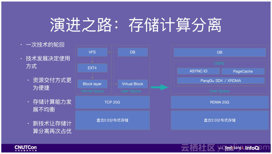 我们最开始上了左边这个架构,将远程存储挂载到本地,这个延迟要较本地盘大很多,核心业务难以接受,在这个基础之上,我们大规模引入RDMA网络,通过DBFS bypass掉kernel,延时基本能和本地盘相当,所以今年所有的核心业务就跑在了这个架构上。
