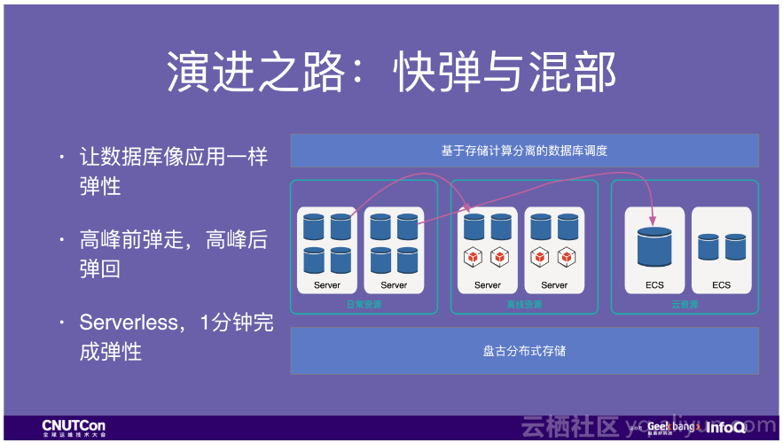 有了容器化和存储计算分离的基础,就可以比较好的解决弹性问题了。之前我们的弹性主要靠搬数据加搬机器,现在数据可以不用搬了。我们大促所用的机器主要来自两个地方,一个是离线资源,另外一个是云资源,我们用完之后云可以继续对外售卖。