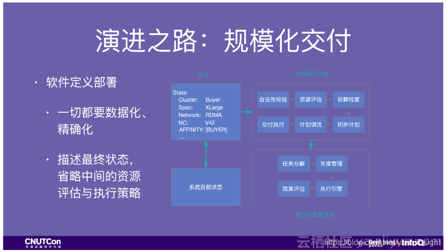 所以我们提出软件定义部署的概念,类似常说的编排。主要做两个事情,一是把我们的这些操作都精确定义和记载下来,线上的运行环境也能用代码精确定义出来。二是把中间的腾挪步骤交给系统,人只需要描述最终的状态,在我们预测准确到一定程度后,这个最终描述状态也可以由系统来完成,真正的完成大促自动化交付。