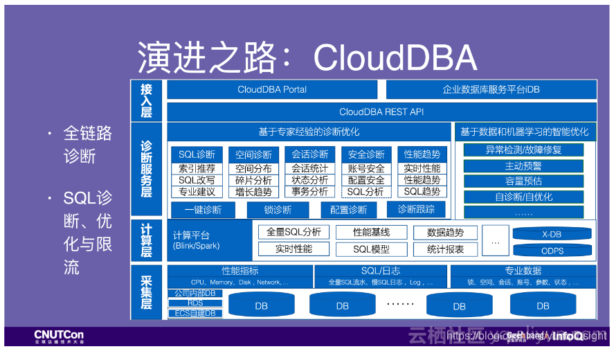 这便是CloudDBA的初衷,先把各种采集到的数据汇聚统一、预处理再加上领域知识和算法,打通从用户到DB,从DB到底层硬件这两个链路。在双11的时候也能实时的诊断访问链路。当然这里待挖掘的还非常多,现在我们可以说只应用了非常小的一部份。