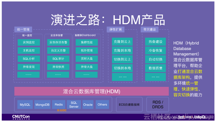 HDM主要提供两大功能,一是统一管理,不管是云上的还是云下还是其他云的数据库,都可以进行统一管理与诊断。二是弹性扩展,一键把数据库上云也不再是梦想。在数据库层消除本地IDC和云的区别。