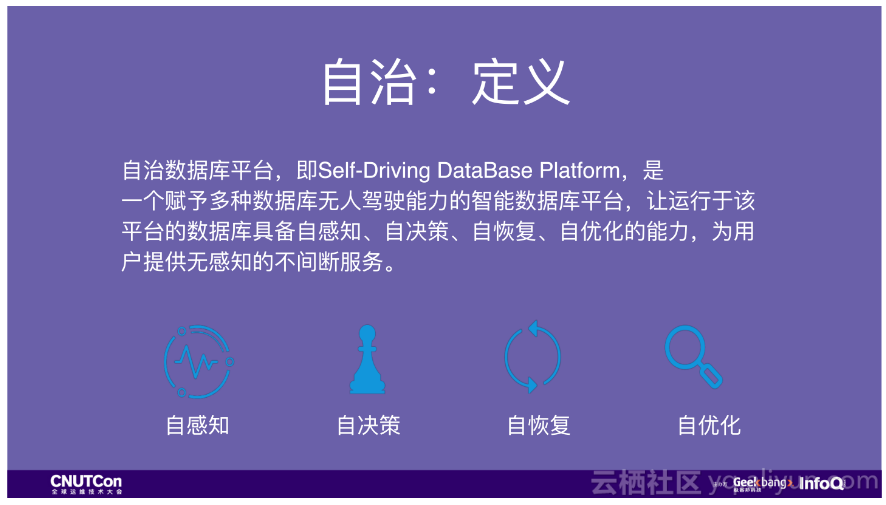 在数据库领域,有自治数据库、智能数据库,在运维领域,有AIOPS等等。这对数据库运维来说到底意味着什么,我们结合过去和现在的情况,提出了自治数据库平台。这个定义是很多人一起讨论了很久才定出来的。