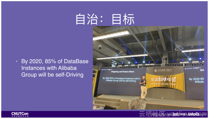 我们也有非常明确的业务目标,这是阿里数据库事业部掌门人公开的目标:在2020财年结束的时候,阿里集团85%的数据库实例要能做到自动驾驶。我为此定了两个评估指标,一是没有人接收这些数据库的报警,另一个是稳定性要达到99.995%。