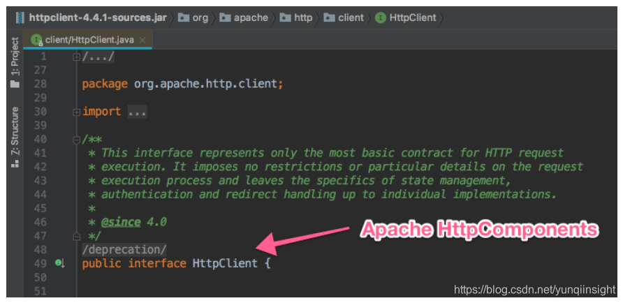从源码上来看,Jakarta Commons HttpClient和Apache HttpComponents Client虽然有很多同名类,但是两者之间没有任何关系。以最常使用到的HttpClient类为例,在commons-httpclient中它是一个类,可以直接发起请求;而在4.x版的httpClient中,它是一个接口,需要使用它的实现类。