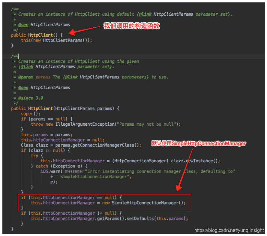 回顾引发故障的那段代码,通过直接new HttpClient()的方式创建HttpClient对象,然后发起请求,问题出在了这个构造函数上。由于我们使用的是无参构造函数,查看三方包源码,会发现内部会通过无参构造函数new一个SimpleHttpConnectionManager,它的成员变量alwaysClose在不特别指定的情况下默认为false。