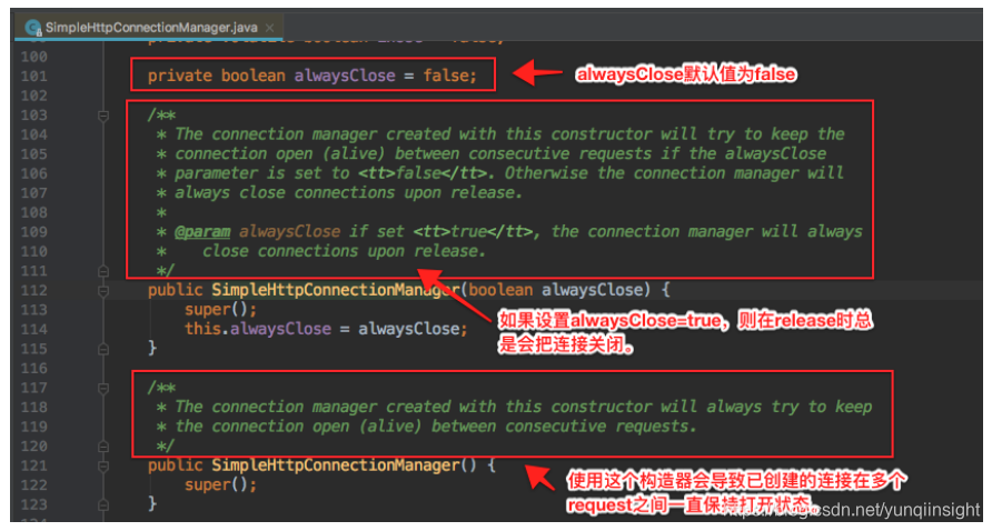(1)初始化方式不对。标记①直接使用new HttpClient()的方式来创建HttpClient,没有显示指定HttpClient connection manager,则构造函数内部默认会使用SimpleHttpConnectionManager,而SimpleHttpConnectionManager的默认参数中alwaysClose的值为false,意味着即使调用了releaseConnection方法,连接也不会真的关闭。