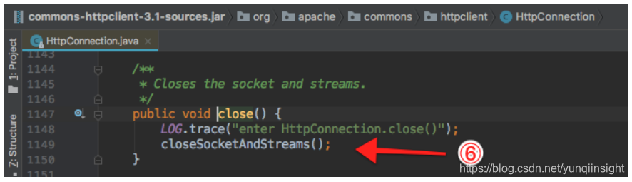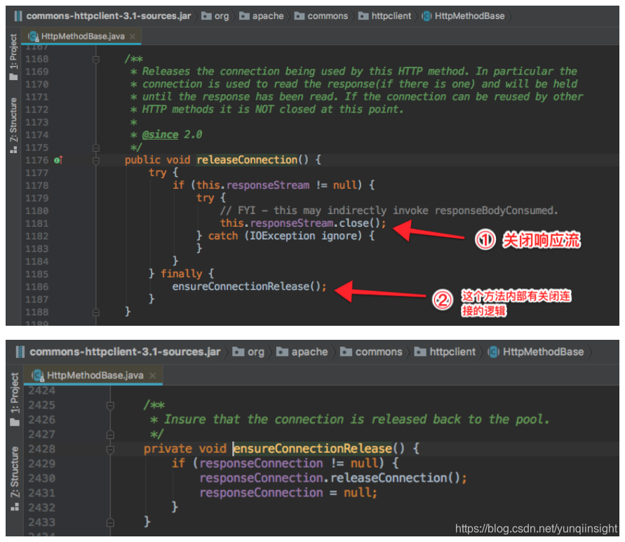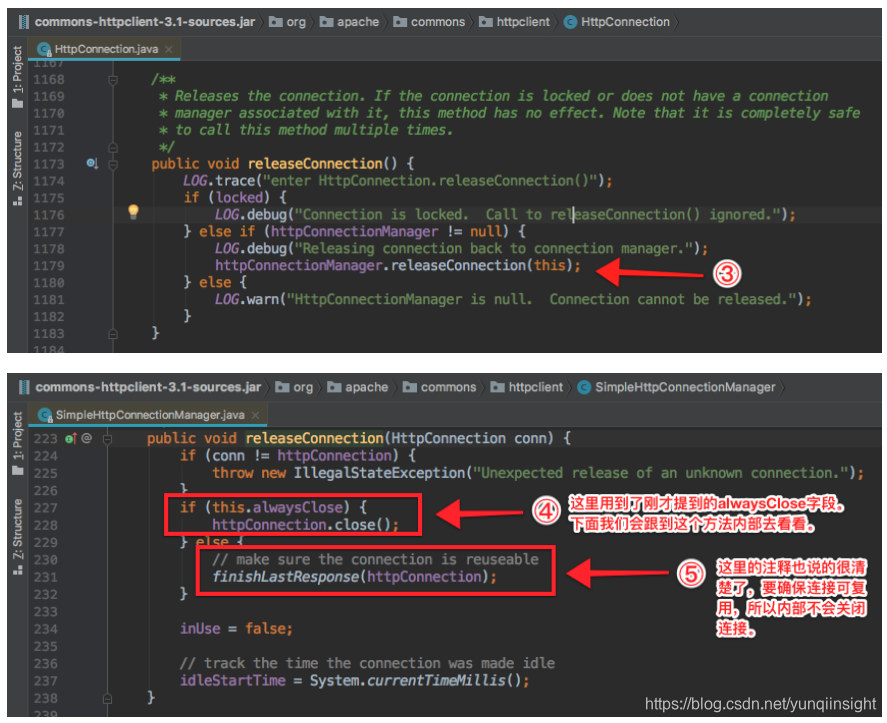 alwaysClose这个值是如何影响到我们关闭连接的动作呢?继续跟踪下去,发现HttpMethodBase(它的多个实现类分别对应HTTP中的几种方法,我们最常用的是GetMethod和PostMethod)中的releaseConnection()方法首先会尝试关闭响应输入流(下图中的①所指代码),然后在finally中调用ensureConnectionRelease(),这个方法内部其实是调用了HttpConnection类的releaseConnection()方法,如下图中的标记③所示,它又会调用到SimpleHttpConnectionManager的releaseConnection(conn)方法,来到了最关键的标记④和⑤。
