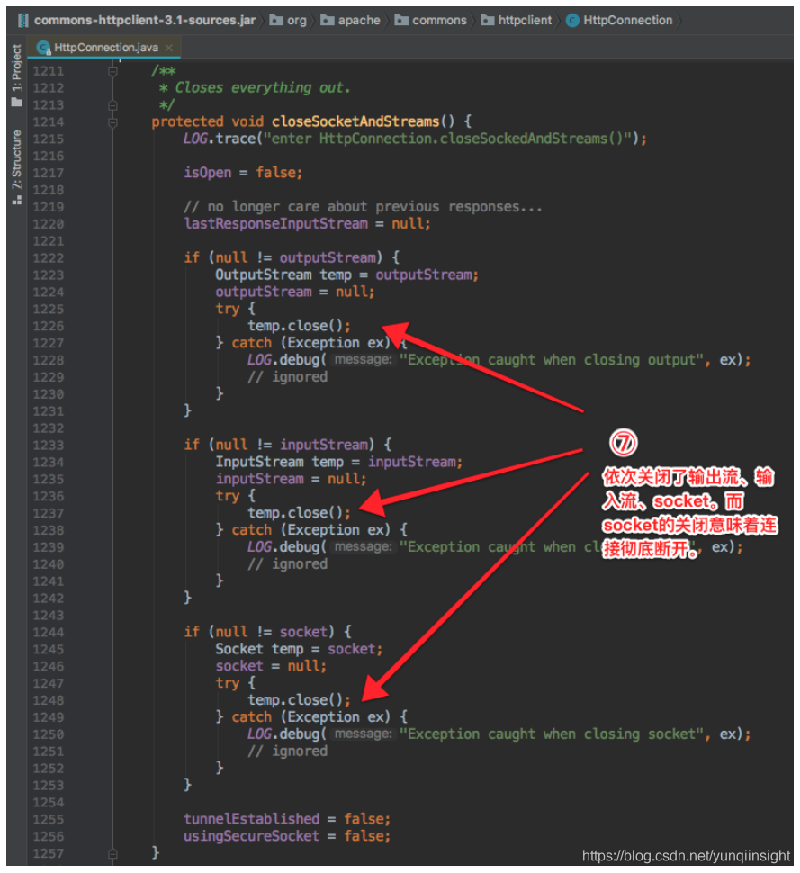 标记④的代码说明,如果alwaysClose=true,则会调用httpConnection.close()方法,它的内部会把输入流、输出流都关闭,然后把socket连接关闭,如标记⑥和⑦所示。