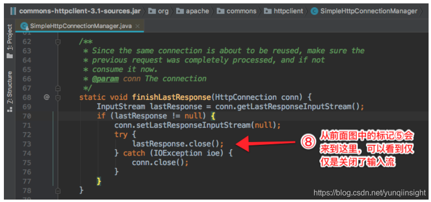 然后,如果标记④处的alwaysClose=false,则会走到⑤的逻辑中,调用finishLastResponse()方法,如标记⑧所示,这段逻辑实际上只是把请求响应的输入流关闭了而已。我们的问题代码就是走到了这段逻辑,导致没能把之前使用过的连接断开,而后续的请求又没有复用这个httpClient,每次都是new一个新的,导致大量连接处于CLOSE_WAIT状态占用系统文件句柄。