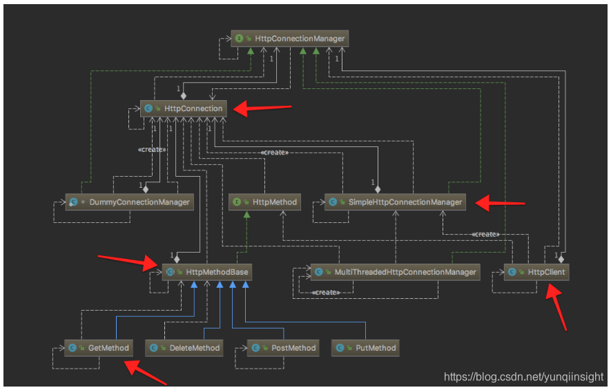 上述提到的几个类,他们的依赖关系如下图(红色箭头标出的是我们刚才讨论到的几个类):