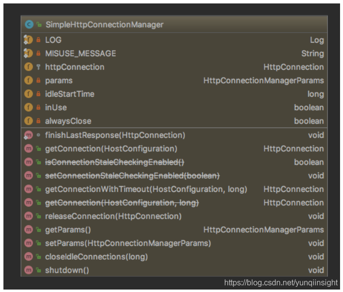 其中SimpleHttpConnectionManager这个类的成员变量和方法列表如下图所示: