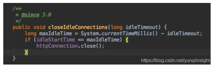 方法2:先调用method.releaseConnection(),然后获取到httpClient对象的SimpleHttpConnectionManager成员变量,主动调用closeIdleConnections(0)即可,对应的三方包源码如下。