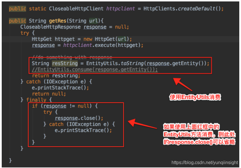 如上图,我们在获取到response对象后,自己决定如何处理返回数据。HttpClient的三方包中已经为我们提供了EntityUtils这个工具类,如果使用这个类的toString()或consume()方法,则上图finally块红框中的respnose.close()就不是必须的了,因为EntityUtils的方法内部会在处理完数据后把底层流关闭。