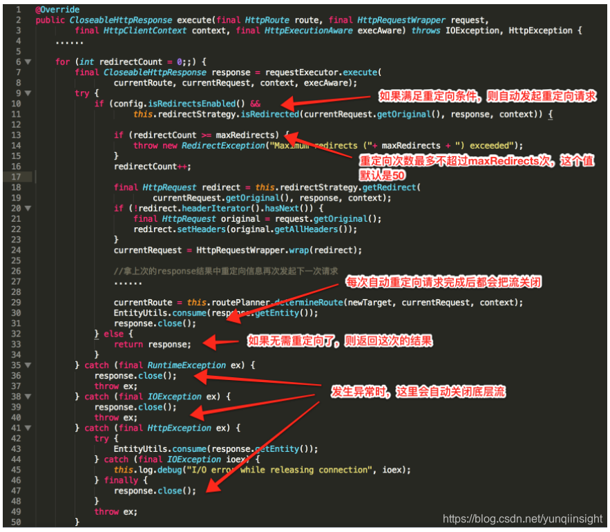 可以看到如果远端返回结果标识需要重定向(响应头部是301、302、303、307等重定向标识),则HttpClient默认会自动帮我们做重定向,且每次重定向的返回流都会自动关闭。如果中途发生了异常,也会帮我们把流关闭。直到拿到最终真正的业务返回结果后,直接把整个response向外返回,这一步没有帮我们关闭流。因此,外层的业务代码在使用完response后,需要自行关闭流。