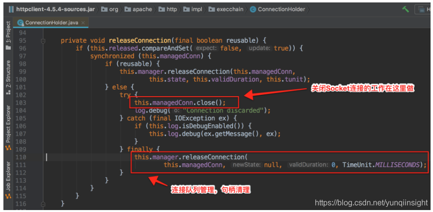 managedConn.close()方法实际是把连接池中已经建立的连接在socket层面断开连接,断开之前会把inbuffer清空,并把outbuffer数据全部传送出去,然后把连接池中的连接记录也删除。manager.releaseConnection()对应的代码是PoolingHttpClientConnectionManager.releaseConnection(),这段代码代码本来的作用是把处于open状态的连接的socket超时时间设置为0,然后把连接从leased集合中删除,如果连接可复用则把此连接加入到available链表的头部,如果不可复用则直接把连接关闭。由于前面传入的reusable已经强制为false,因此实际关闭连接的操作已经由managedConn.close()方法做完了,走到PoolingHttpClientConnectionManager.releaseConnection()中真正的工作基本就是清除连接池中的句柄而已。