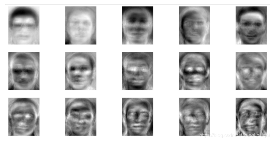 其实 data_transformed 中保存的特征脸按照像素排列之后也能看出特征脸的形状。图中有15个特征脸,足以用来做一个人脸分类器。