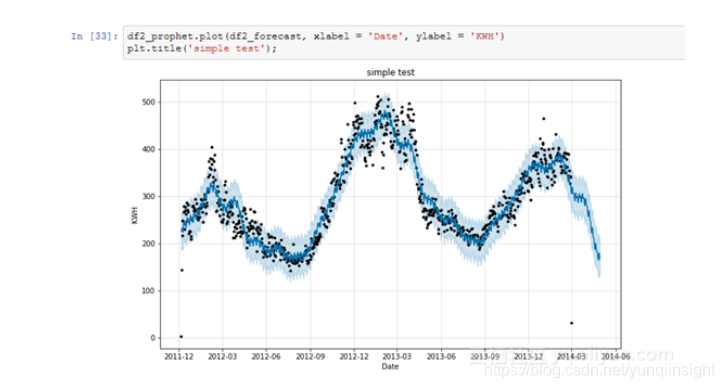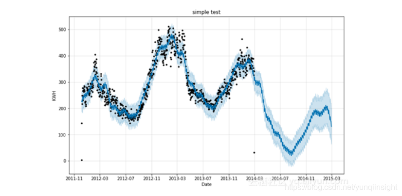图中的黑点代表了实际值,蓝线则代表了预测值,而浅蓝色阴影区域代表不确定性。