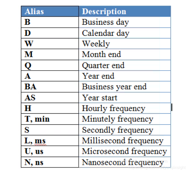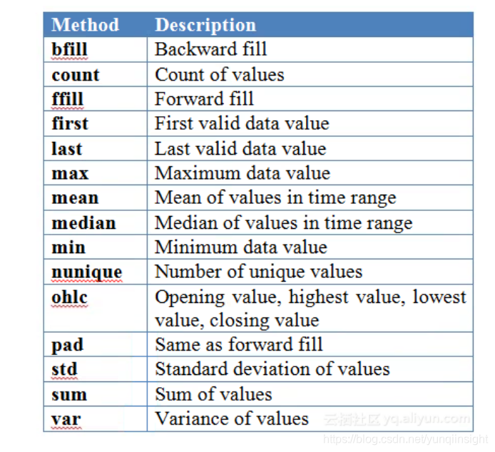 为了进一步进行重新采样,pandas有许多内置的选项,你甚至还可以定义自己的方法。下面两个表分别显示了时间周期选项及其缩写别名和一些可能用于重采样的常用方法。
