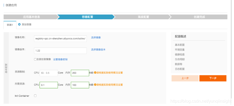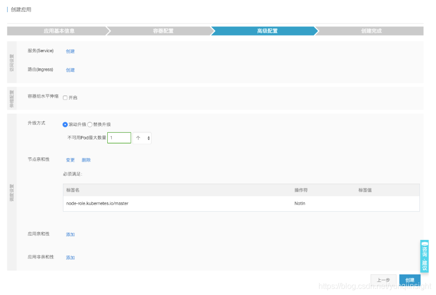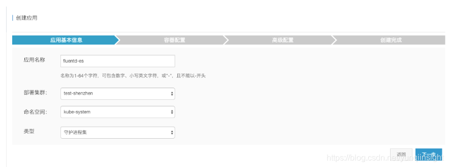 填写应用名称,选择部署集群、命名空间,进入下一步
