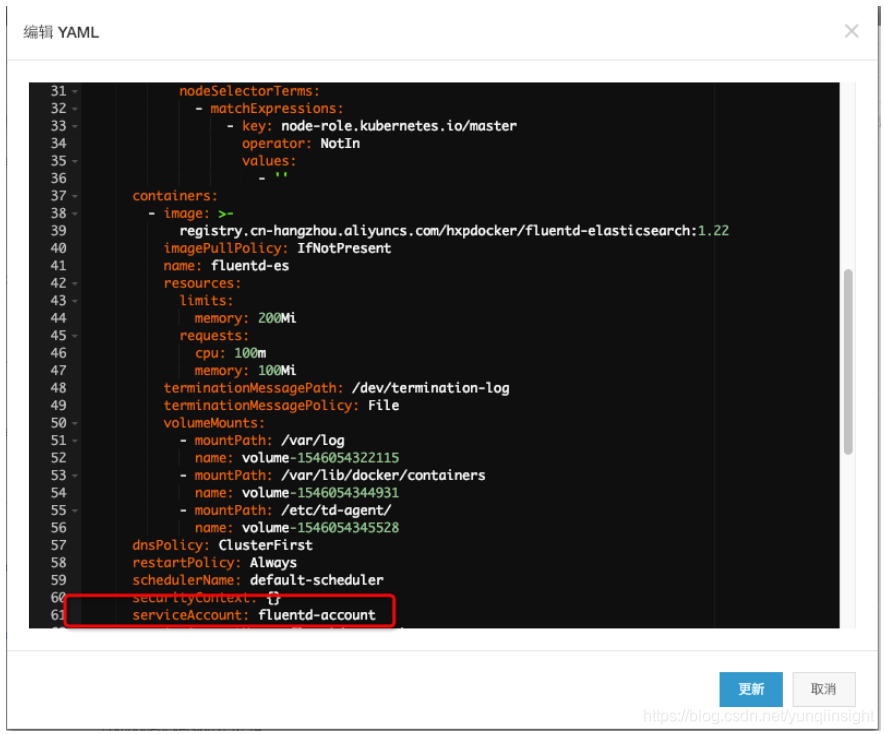 创建成功后更新fluent-es 的yaml,编辑yaml,提交更新。