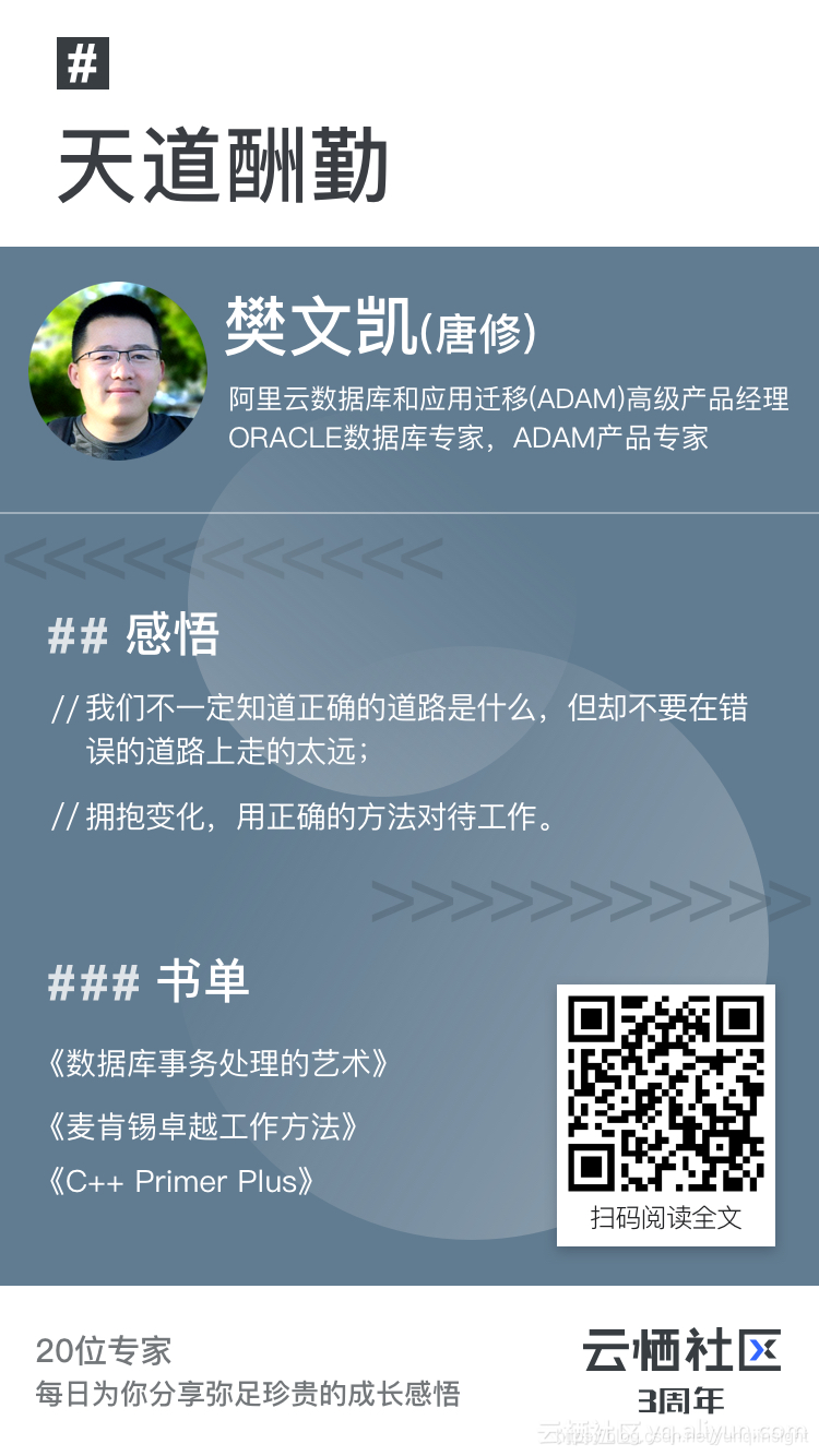 唐修,阿里云数据库和应用迁移(ADAM) 高级产品经理。在社区和钉群很活跃,尤其在最近业内比较关注的话题:Oracle数据库和应用上云,怎样做最靠谱?很有见地。此外还有系列内容: