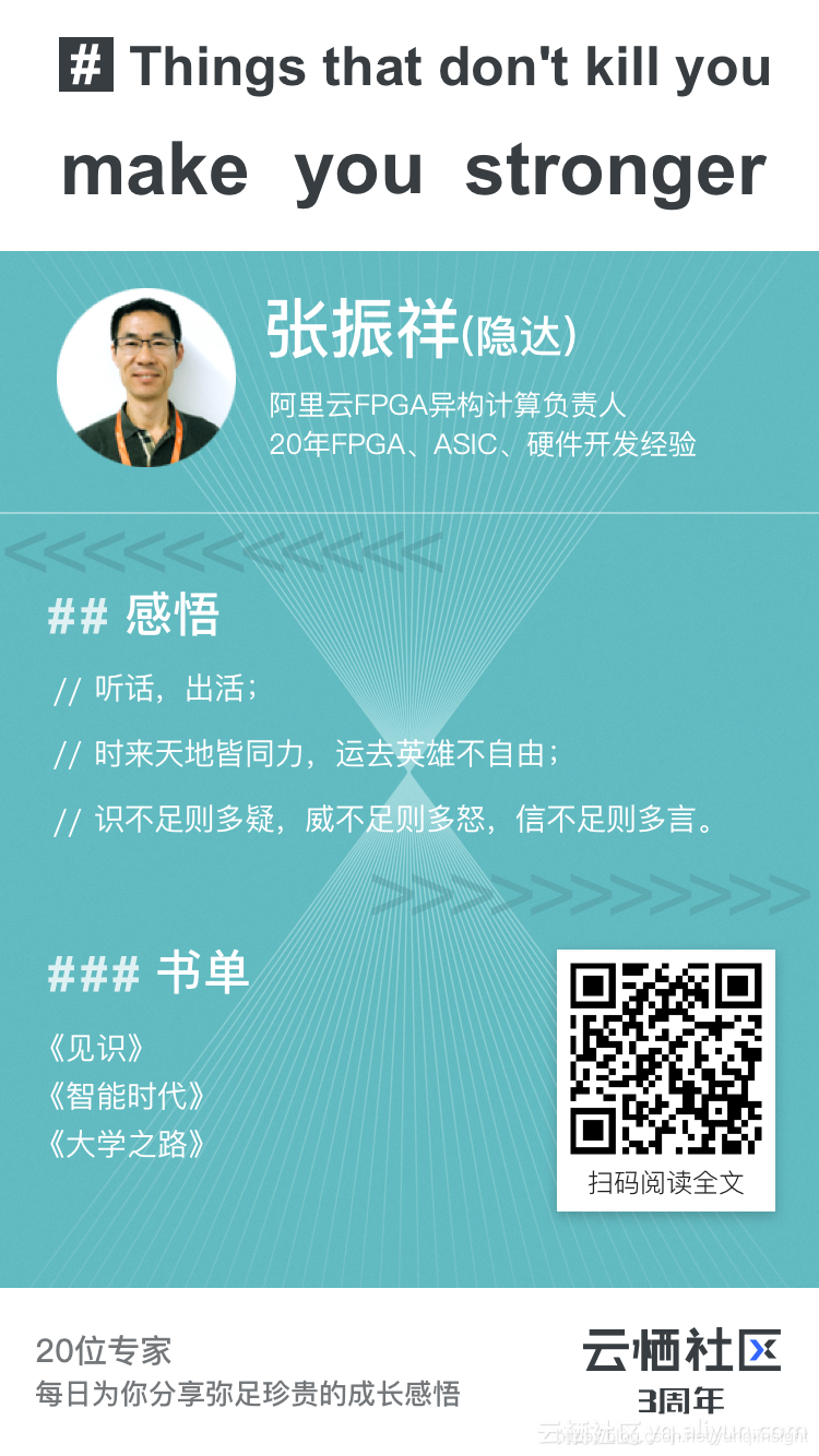 隐达是阿里云FPGA异构计算负责人,花名寓意是做人隐,做事达。在社区的专家页面中,如此介绍自己:业余时间喜欢看美剧和读书,尤其是历史书;还喜欢喝点小酒侃大山,喝酒只喝啤酒和威士忌;酒量比较差,但是酒品还过得去。我在某通信公司工作了18年,其中十年的大规模FPGA/ASIC开发、系统设计作。期待更多系列内容。