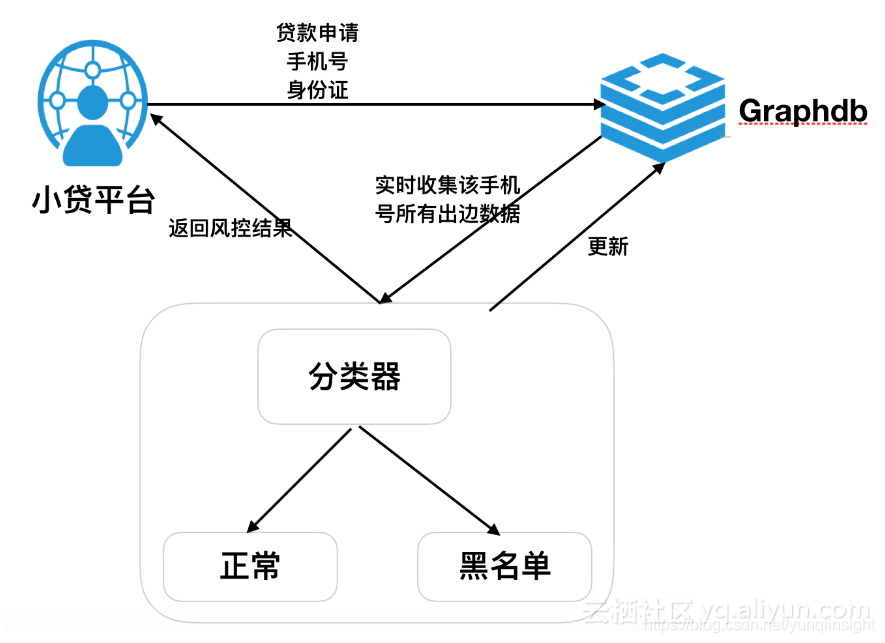 在申请贷款流程中,可以通过使用图库可以实时查询图中任意一手机号关联的身份证数量(一跳/二跳查询),恶意申请有如下特点,关联子图各类顶点过多,并且可能关联上离线分析标注过得黑名单用户,说明当前用户存在恶意申请风险,实时拒掉贷款申请。下图显示如何与自身小贷平台打通,做实时风控预警,箭头方向代表数据流方向。