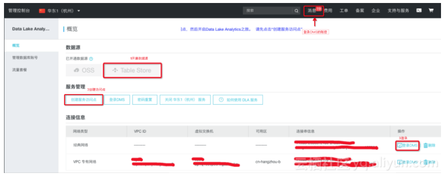 用户进入产品介绍页,选择开通服务:https://www.aliyun.com/product/datalakeanalytics - 通过DLA控制台开通TableStore数据源