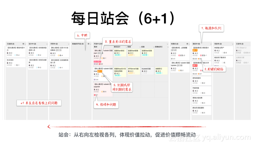站会上,团队按照"站会重点关注信息6+1"从右向左检视各列,促进价值顺畅流动,同时要避免在一个问题上花费过长时间,耗时长的讨论要放在会后小范围进行。