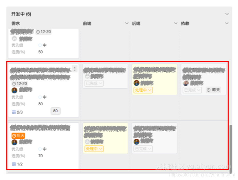 A:图中用红框圈起来的两个需求,一个是前端任务已完成,后端任务在处理中,另一个是前端任务在处理中,后端任务已完成,这总情况需要避免,团队需要聚焦其中一个需求,让其快速完成,而不是启动两个,让两个都只是完成一半或90%。