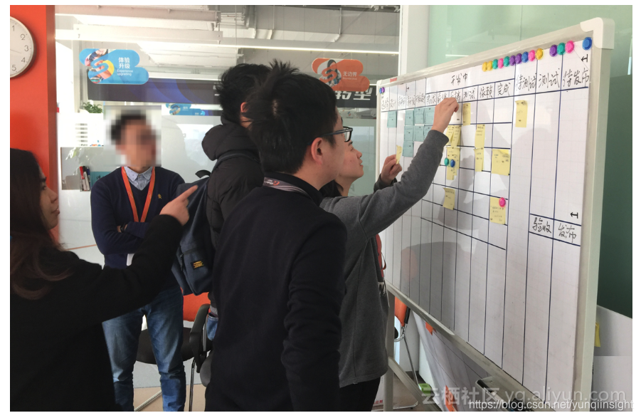 2、三个相同:同一个团队在同一时间、同一地点在看板前进行日站会,形成固定的节奏后,会变成团队的习惯;