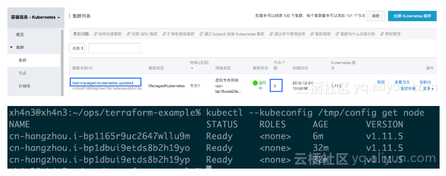 Terraform apply 运行成功后,控制台中显示的集群信息已经表明现在集群已经变成了我们期望的状态。在本机上,我们也通过导出的连接文件,用 kubectl 连接到集群。