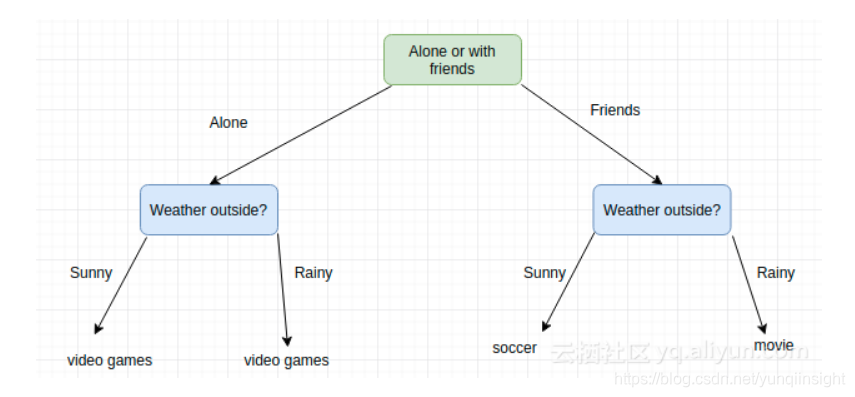 在现实生活中,我们常常用过类似于决策树的方式来决定自己的生活。例如,决定周末安排什么样的活动。采取怎样的活动可能取决于一些因素,比如是否愿意和朋友一起出去或独自度过周末、周末的天气如何等。假设就这两个因素影响你做出决定的话,如果天气晴朗,并且你的朋友可以一起参与,那么你可能想踢足球。如果是下雨天,可能会一起去看电影。如果朋友有事无法参加,那么无论天气如何,可能会去看会书、玩会电子游戏。