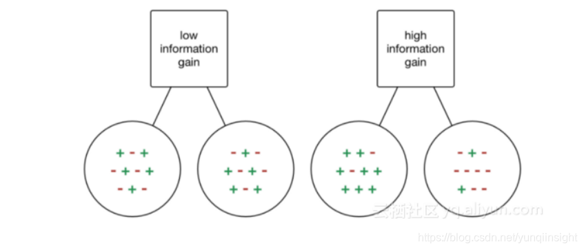 如果选择了某种划分,其中每个输出根据输入数据混合类别,这种情况实际上根本没有获得任何信息; 另一方面,如果采取的分割对于每个输出的类的正确率都很高,那么已经获得 了在具体特征变量上以特定方式分割的信息。