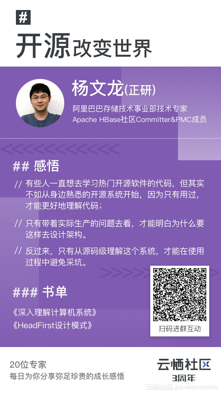 正研,社区HBase社群大V。在他的博文中,《HBase2.0中的Benchmark工具 — PerformanceEvaluation》、《深入解读HBase2.0新功能之高可用读Region Replic》、《深入解读HBase2.0新功能之AssignmentManagerV2》、《消灭毛刺!HBase2.0全链路offheap效果拔群》可以清晰看到经验的积累。