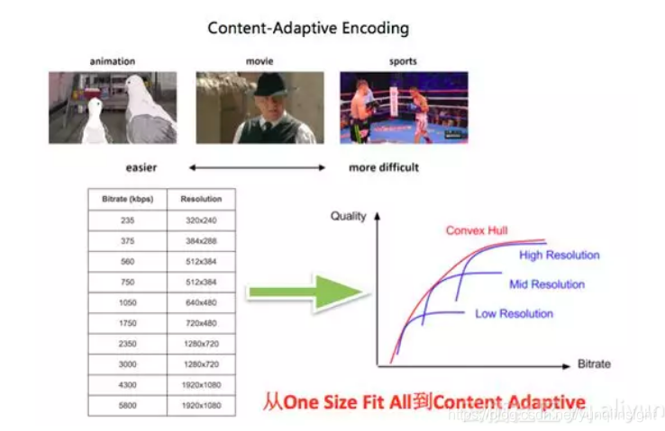 视频编码以前简单地采用固定压缩参数,固定码率和固定分辨率,对于HLS和MPEG-DASH的ABR(Adaptive Bitrate),也用固定编码率和分辨率来配对。这就无法满足不同视频对码率的不同需求。1M的720P动画片看起来可能已经不错了,但是1M的720P动作片看起来就会很糊。