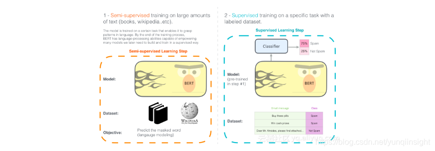 两种不同的BERT。你可以下载在1中预训练的模型(它是在未注释的数据上进行训练),在2中是针对特殊场景对其进行微调。