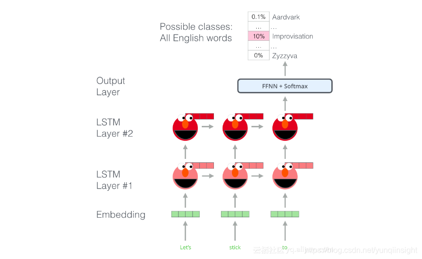 ELMo预训练过程中的一个过程:给定输入,预测下一个最可能的单词。在诸如“hang”之类的单词出现之后,它将为诸如“out”之类的单词赋予比“camera”更高的概率。