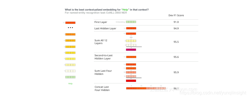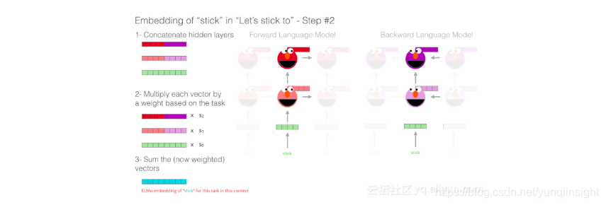 ELMo通过以某种方式将隐藏状态(和初始嵌入)组合在一起来提出情境化嵌入(连接后加权求和)。