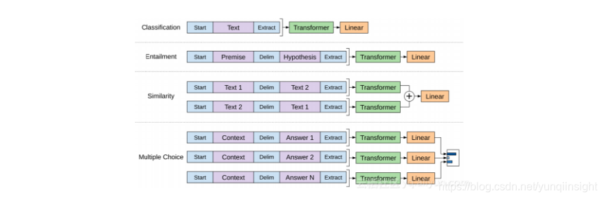 OpenAI论文概述了许多输入转换,以处理不同类型任务的输入。下图显示了模型的结构和输入转换,以执行不同的任务。