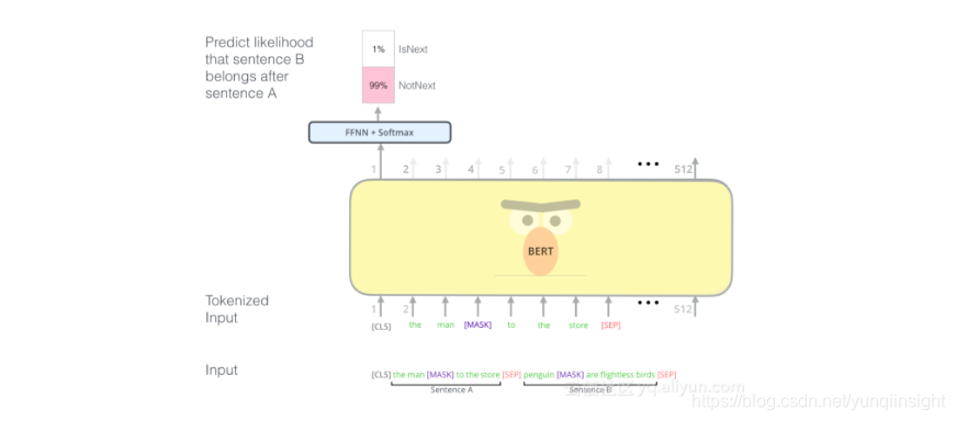 为了使BERT更好地处理多个句子之间的关系,预训练过程包括一个额外的任务:给定两个句子(A和B),B可能是跟随A的句子,或不是?